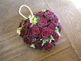 | バラ(ブラックバッカラ)を用いたハート型のバック型ブーケ。 シャンパンゴールドのドレスに合わせました。 |
