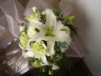 | ブーケの中でも代表的なキャスケード。 白ゆり、バラ、トルコキキョウなど様々な白いお花を用いてクラシカルな仕上がり。 教会式の厳粛なセレモニーにふさわしいブーケとなりました。 |